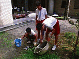 3日間、掃除をできていなかったカメ吉の住み家を僕達篠栗北中学校の男子3人で磨き上げました。掃除を行う前は、とても緑が多く、ヌルヌルしていて、とても汚れている状態でした。ブロックもみがき、綺麗にしました。とても大変でしたが、終わった後の達成感は、大量の洗濯物を全てたたみ終わった後のような感覚でした。(A型)