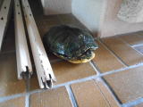「こんなところにカメがいます!」昨晩、当センターのアイドル、中庭にいるはずのカメ吉が、なんと1階ロビーの階段下で発見されました。利用者が発見し、事務室に連絡してくれました。あわてて職員が駆けつけると、中庭から10メートルほど離れた階段下にカメ吉がうずくまっていました。人間にとっては、たかが10メートルですが、カメ吉にとっては大冒険。どうやって扉のサンを超えたのだろう?ここまで何分かかったのだろう?あれこれ思いをめぐらせながら、いつもの中庭に戻したのでした。動きが遅いイメージのカメですが、もしかしたら、かなりのスピードで移動できるのかもしれませんね。見てみたいものです。なにはともあれ、発見されてよかったです。(yamakaze)