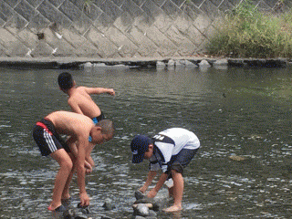 渓流遊びの次はホタルのエサになる貝の仲間、「カワニナ」を採りました。何匹捕まえられたかな~?(ぱおとん)