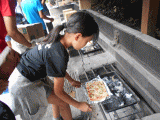 チーズがトロ~リ!生地がサクサクッ!オーブンや釜で焼くピザですが、本日、なんとダンボール釜でピザを焼いています!ダンボール箱の内側にアルミホイルを貼りつけることで、熱が反射し、内部がオーブンのようになるのです。3日連続野外炊飯を行っている子どもたちは、準備もスムーズ!一人一枚(A4サイズ)思い思いの具をのせ、いざオーブンの中へ!ダンボールですので中が見えないのが残念ですが、チーズの溶けた良いにおいが・・・。10分で出来あがり!自然教室やキャンプはもちろんですが、このような方法を知っておくことで、いざというときにも役に立ちそうですね!(茶々丸)