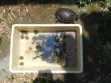 当センターには大小あわせて14匹のカメたちがいます。最初は警戒してなのか、職員が近づくと逃げていましたが、根気よく話しかけたり食べ物をあげたりしていると、逃げなくなり、今では近づいてくるようになりました。人もカメもコミュニケ―ションが大事という事ですね。(がんじろう)