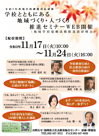 明日11月17日(火)より、令和2年度 現代的課題対応研修 「学校とともにある地域づくり・人づくり推進セミナー」をWEB 開催します。今年度は、地域学校協働活動やコミュニティー・スクールの一体的推進や協働体制整備等でご活躍されている4名のコンサルタントやCSマイスターの先生の講義動画を配信します。講義資料もダウンロードできます。参加申込みは不要です。是非、ご視聴ください。
