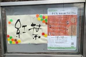 秋も終盤に差し掛かっていますが、全国的に季節外れの気温が続いています。しかし、周囲の木々は落葉が進み、冬が近づいていることを感じさせてくれます。当センターの玄関先にある掲示版も紅葉しています(^^)