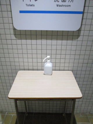新型コロナウイルス感染症の感染拡大防止が課題です。お越しの皆様に安心して当センターをご利用いただけるよう、必要なものを購入したりアイディアを出したり、職員一同頑張っています。この写真の消毒液は体育館前のトイレに設置したものです。ここ以外の場所にも消毒液を設置していますので、感染拡大防止のために、シュッとひと吹きご利用ください。(HCl)
