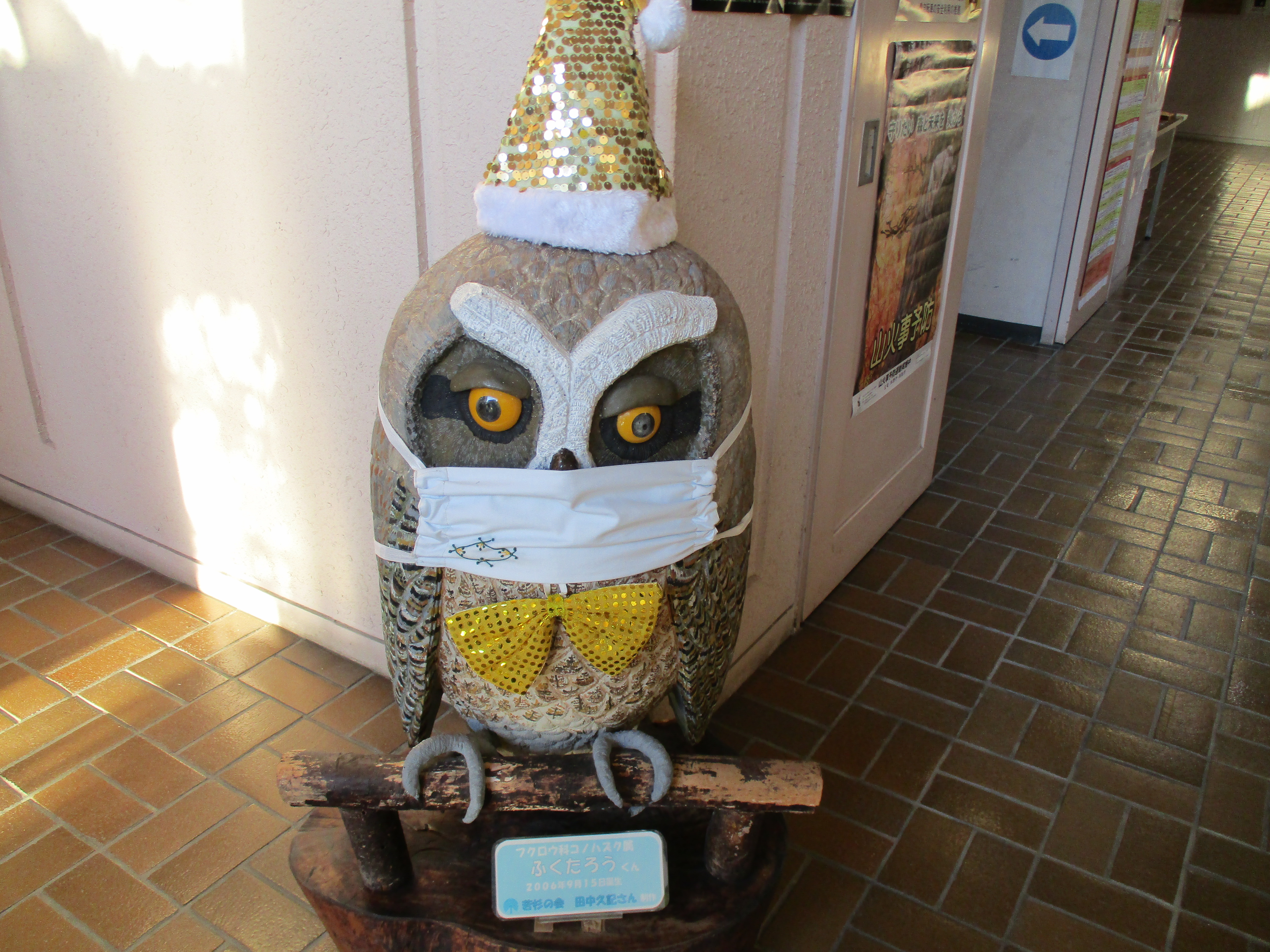 写真は、当センターの「ふくたろうくん」です。ご覧のとおりクリスマス仕様になっており、大変可愛らしいですよね。来年は、このマスクが取れることを切に願うばかりです。