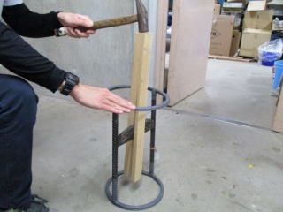 「何の写真かな?」と思われた方も少なくないかと思います。左の写真は、先日、当センターが導入した「安全薪割り台」を使用して材木を割ってみた様子です。写真のように薪や材木など、割りたいものを台の刃に置き、金づちなどで上から叩くと、簡単にものを割ることができます。刃が台に固定されており、また円形の取手がついているため、安全かつ円滑に体験活動をすることができると思います。私も体験してみましたが、非常に簡単で、大して力も入れることなく、材木を割ることができました。
