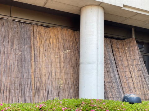 - 6月といえば梅雨のシーズンですが、ここ数日は梅雨の中休みでよい天気続き。今日も予想最高気温は32度と暑くなりそうです。さて、私どもが仕事をしている部屋は南西向き。午後から太陽の日差しがたっぷりと入るので今日みたいな日は暑い暑い。そこで昨日から登場したのがこの葦簀(よしず)。窓から差し込む日光を遮断しつつ風を通す効果で、この時期の社教センター暑さ対策に欠かせない葦簀です。今年の夏も高温傾向にあるそうですが梅雨も明ける前からこんなに暑いと先が思いやられますね。まだまだ体が暑さに慣れていないと思いますので、皆様、暑さ対策をしっかりしながら熱中症等気をつけてお過ごしください。(うっしー)
