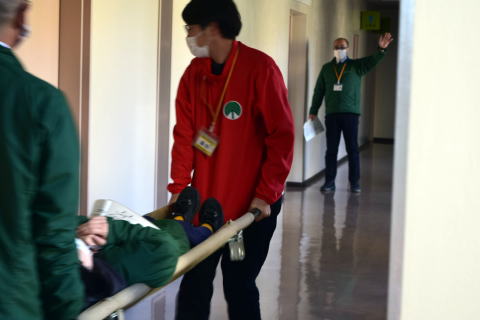 当施設は、多くの方が利用され、また、宿泊利用の方も多いため、年2回訓練を実施します。今日の訓練では、火事が起こった際に、負傷した方がいる場合を想定した訓練等が行われました。