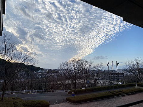 - 様々な形の雲が見られました。雲にも高さや量で種類が分けられます。冬の雲は、低い位置にある雲が多く、少し黒く見えるそうです。暗く見える雲と筋状の雲、そして綺麗な青い空。1日1日表情が変わって素敵ですね。皆さんはお気に入りの空の表情はありますか?(しろ)