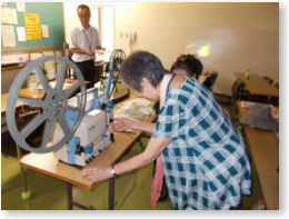 | 受講者に16ミリ映写機の操作技術を身につけていただくために、2種類の映写機(半自動式・手がけ式)を使って操作の練習をしました。映写機準備からフィルムの装填、巻き戻しまでの一連の操作を繰り返し行いながら、技術を習得することができていました。 |