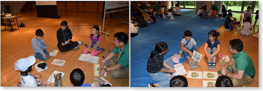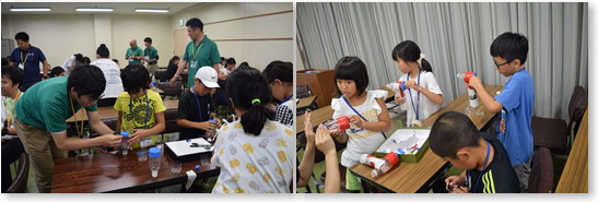 | 1日目に飲んだスポーツドリンクのペットボトルを使って、ペットボトル空気砲を作りました。参加者は、仲間やボランティアと相談しながら活動することができました。風船をペットボトルにつけることがなかなかできずにいる子どもたちもいましたが、仲間と協力して無事につけることができました。完成したペットボトル空気砲で、的を倒して楽しく遊ぶ姿がとても印象的でした。 |