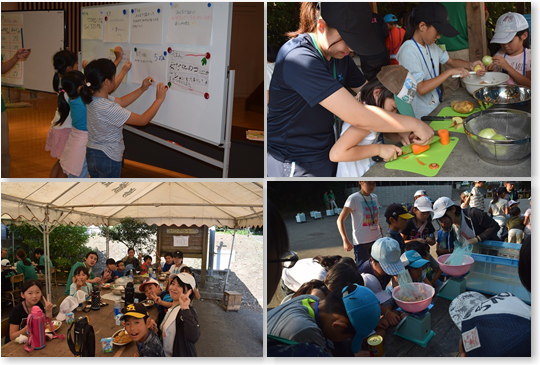 | アイスブレイクで仲良くなったグループでエコクッキングを行いました。始めに、エコクッキングについての学習を行い、使用する洗剤の量や調理で出る生ごみの量をどのくらいにするのか、グループごとに目標設定しました。次に野外炊飯では、薪割りや調理などを分担して、食材や洗剤・水などを無駄遣いしないようにして、おいしいカレーライスを作ることができました。最後は、自分たちがどのくらいの洗剤を使ったのか、どのくらいの生ごみを出したのかを量りました。目標の数値を達成できたグループも、達成できなかったグループもありましたが、全員がエコを意識しながら活動することができました。 |