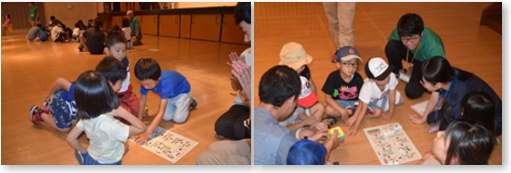 | レクリエーションでは、自己紹介すごろくを行いました。参加者とボランティアが、すごろくをしながら進んだ先に書いてあるお題に答えていきました。初めは、保護者の方と別れ、不安になって泣き出してしまう参加者が多く、スタッフも戸惑っていました。しかし、ボランティアスタッフの方々が、参加者に優しく微笑み話しかけてくれたおかげでたくさんの笑顔を見ることができ、参加者の緊張もほぐれ、お互いのことをたくさん知ることができました。 |