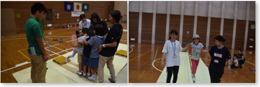 | レクリエーションで仲良くなった班できずなの森プログラムを行いました。きずなの森プログラムでは、ジャンボシーソー・ラインナップ・人口密度・フラフープリレー・バランスウォーク・リングスクエアに挑戦しました。みんなで目標を達成するために、積極的にチャレンジしました。ボランティアスタッフのお兄さんやお姉さんに手を添えてもらいながら、楽しく活動することができました。どの班も、自分の考えを出し合って話し合う場面が多く見られ、協力して活動することの大切さを学ぶことができました。 |