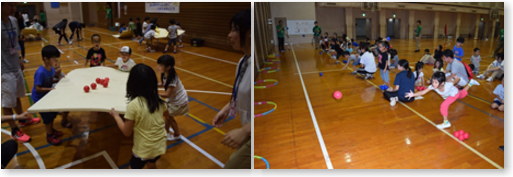 | 夜の活動として、室内運動会を行いました。種目は、「ボール運び競争」「フラフープリレー」「ボッチャ玉入れ」で、どの班も優勝を目指してチーム一丸となり意欲的に頑張りました。どの種目においても盛り上がり、どの班も接戦でとてもいい勝負でした。友だちが頑張っていると、応援席から自然に「がんばれー!」と大きな声で応援している姿がとても印象的でした。 |