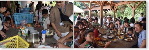 | 2日目の活動は、野外炊飯です。みんなで協力してお昼ご飯を作りました。メニューは、グループで選択した「ハヤシライス」や「豚汁」、「フルーツカクテル」です。グループで役割分担をして、購入した食材を切ったり、薪を割ったりして自分たちの手で作り上げました。みなさん仲良く和気藹々と活動されていました。 |