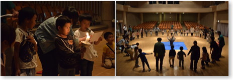 | 夜の活動では、キャンドルのつどいを行いました。第1部では、それぞれの班で代表の子どもが、火の神からろうそくに火を灯してもらいました。第2部では、次の日の米の山登山に向けて、どの子も自分の目標を力強く発表する姿が大変印象的でした。また、レクリエーションでは「すてきなともだち」をみんなで踊ったり、「じゃんけん列車」をしたりして、楽しいひと時を過ごしました。 |