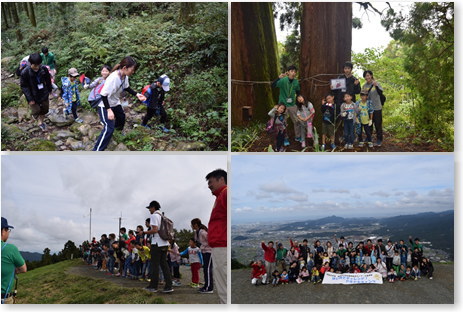| 「はじめてチャレンジ!ドキドキキャンプ!」のメインプログラムである米の山登山です。1回目は、「大和の大杉」を目指したプチ登山をしました。2回目は、本格的な米の山登山ということで歩く距離や時間、そして挑戦度が段階的にアップしていくプログラム構成になっています。登山の途中で、何度も諦めそうになった子もいましたが、仲間に応援してもらったり、ボランティアスタッフから手を握ってもらったりしながら最後まで諦めずに登りきることができました。全員でたどり着いた頂上には、篠栗の街を一望できる絶景が待っていました。全員で「ヤッホー!」の声を社会教育総合センターの建物に向かって届けることができました。その後は、篠栗の街を眺めながら美味しいお弁当を食べて、全員無事に下山しました。 |