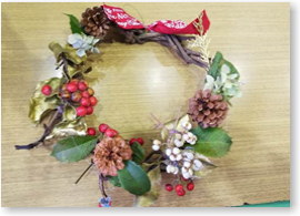 センター周辺でとれた「つた」を巻いて作った土台に、木の実や松ぼっくりなどで装飾をして、きれいなリースを作りました。