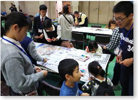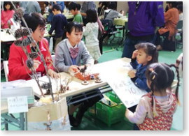 その他館内の研修室では「ワイワイ動物ふれあいコーナー」「お茶席体験」「陶芸体験」などのブースも出店しました。また1階のロビーでは、当センター学習ボランティア「若杉の会」によるパネルシアターも行われました。 |