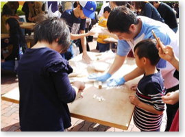 正面玄関前広場では、障害者福祉施設等による「バザー」や「手打ちうどん作り」「木工体験」の3コーナーを出店しました。 |