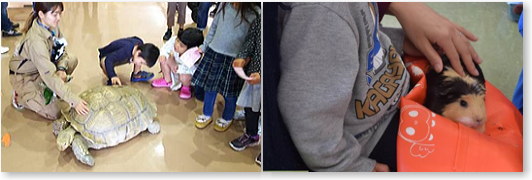 ECO動物海洋専門学校の学生さんたちが、色々な動物と触れ合えるブースを出店してくれました。大きなカメや、普段はあまり見かけない毛の長いウサギなどに触れたり、色々な爬虫類を観察したりして、子どもたちは大喜びでした。 |