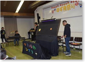ゆずフェスティバル1日目は、宿泊者を対象とした開会セレモニーに始まり、夜の活動は「ゆず夜祭り」「パネルシアター」「映画鑑賞会」を行いました。また夕食はレストランでのバイキングを、お風呂はゆずを浮かべた「ゆずホットタイム」を楽しんでいただきました。