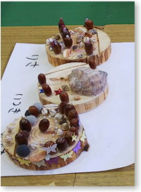 センターでとれた桜の木のチップを土台に、どんぐりに絵を描いたり、ビーズをくっつけたりして装飾を行いました。