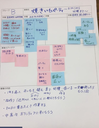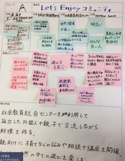 「グループでコラボして事業計画を考えよう」について、所属の良さや特徴を生かした事業のアイディアを出し合いました。「@コラボして」「Aつながって」「B子どもたちのために」の3つの視点から、グループで様々な所属の特徴を生かしたコラボした事業企画について、組み合わせたり、付け加えたりしながら、できそうな事業企画をワークシートにまとめていきました。