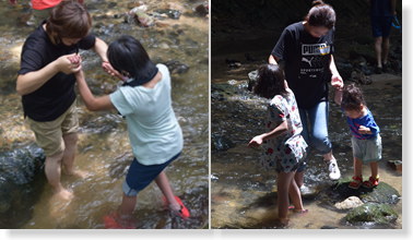 ・日差しが強く、暑かった場所から一転、涼しい場所に入り、自然の中で川遊びをしました。川の水は冷たく、心身ともに自然の中で涼しさを感じることができました。親子で自然に触れ、川遊びを笑顔で楽しむ姿が印象的でした。