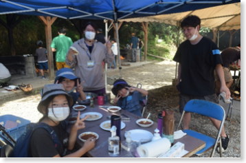 薪割りやファイヤースターターを使った火おこしにもチャレンジしました。ファイヤースターターはこつをつかむまでが難しいです。見事、火がついたとき、「すごい!」と歓声が挙がり、褒め合う姿がみられました。日頃、なかなか体験できない野外での調理に少しとまどう様子もありましたが、無事においしいカレーとナンを味わうことができました。