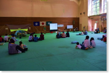 <開講式> 本来は社教センターグラウンドに「特設オートキャンプ場」を設定して、キャンプ演習を行う予定でしたが、不安定な気候への対策のため、体育館やあじさい広場野外炊飯場で活動することになりました。急な変更となりましたが、参加者の皆さんは楽しみにしてくださった様子で開講式でもしっかりと私たちの話や説明に耳を傾けていました。