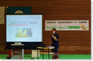 <講座@「キャンプの基本」> 講師の九州共立大学スポーツ学部助教の花田道子先生から、「キャンプとは何か」「キャンプの良さ」「キャンプのマナー」「危険予知」等について、先生の豊富な経験や体験を交えながら、お話ししていただきました。「危険予知」ではキャンプ活動に潜む様々な危険を想定する「KYT(危険予知トレーニング)」の演習も行いました。家族で真剣に楽しく話し合う姿がみられました。子供達は考えを発表してくれました。初めて出会った人たちの前で発表するのは大変なチャレンジだったと思いますが、家族で話し合ったことを発表しました。