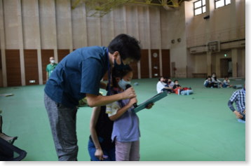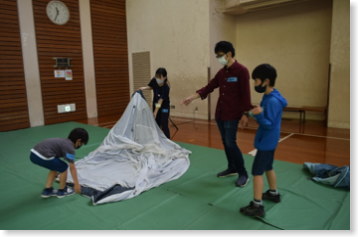 この時間からキャンプ体験のスタートです。まず、キャンプ場では自分たちが生活する場をつくることが必要になります。生活の場の中心となるのが「テント」です。今回は「ドームテント」を皆さんと組み立てました。体育館での実施のため、「ペグ」で本体やフライシートを固定できず、本格的とはなりませんでしたが、家族で組み立てて、中に入ったことは初めてということもあり、皆さんとても楽しんでいました。