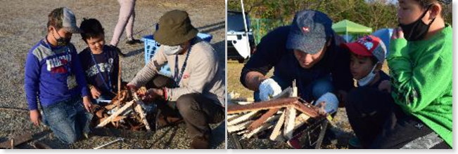 生活空間が整ったら、夕食づくりの時間です。まずは、火おこしをして、焚火をしました。「前回のリベンジを!」と言って、ファイヤースターターでの火おこしに果敢にチャレンジしていました。大人も子どもも体を寄せ合って、火おこしをする姿が印象的でした。