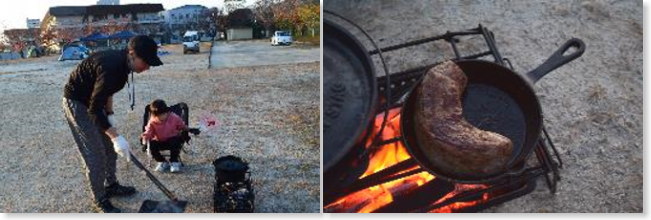 今回は、スキレットで「ローストビーフ」を焼き、ダッチオーブンで「ポトフ」、フライパンで「パエリア」を作りました。牛肉の焼ける「ジュー」という音に各家族から「おいしそう」と歓声が上がっていました。