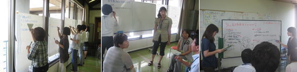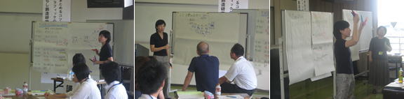 | 「会議で大切にしていること」などといった4つの演題をもとに、全員がファシリテーターやファシリテーショングラフィックを行いながら、演習を積んでいきました。各テーマの話し合いごとに、どのような話し合いが行われたのか、ファシリテーターやファシリテーショングラフィックを試みての疑問点などを講師の先生が各グループごとに整理されたので、そこでの改善点を次の話し合いに生かすことができました。 |