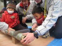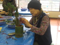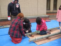|  |  |  |  | ↑グループの皆さんで協力して、土台となる竹を切っています。 皆さん真剣な表情です!! | ↑初めてのこぎりを持ち竹を切っている様子です。 がんばってやり遂げました!! |  |  |  |  | | ↑飾りの竹を固定して砂を入れています。うまく固定できていますね!! | ↑松・赤い実・梅を飾っています。 あと少しで完成です!! | ↑完成!! | | |