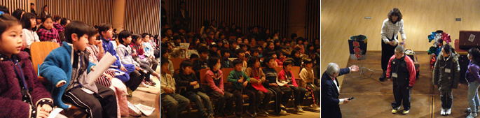 キャンドルナイト・・・昼間に並べた手作りキャンドルに火を灯しました。上の階から見てみると、「ワクドキウインター」の文字がきれいに浮かび上がりましたね。学習ボランティア「若杉の会」の方によるパネルシアターと、マジシャンMr.Kooによるマジックも、楽しかったですね! |