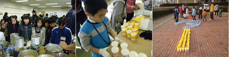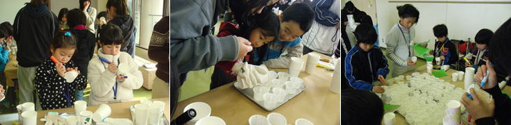 キャンドルアート・・・ひとり10個ずつキャンドルを手作りしました。キャンドルホルダーの紙コップには、それぞれの夢や今年の目標、好きなイラストなどを書きました。出来上がったキャンドルは、班ごとに並べて、夜に火を灯すのを待ちます。 |