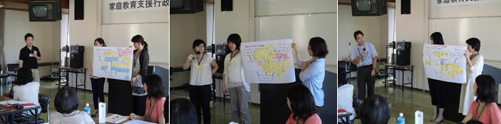 家庭教育をめぐる現状と課題をふまえ、学校・家庭・地域が連携した支援の方策について、グループワークをとおして考えることができました。家庭教育支援に関する情報交換もたっぷりできました。 |