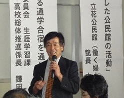 | 八女市の立花公民館、古川館長より地域の「ひと、もの、こと」を活かした公民館での取り組みをこれまでの体験をもとに話をしていただきました。人と人とのつながりを大事にすること、地域の教育資源を発掘することの大切さ、など社会教育の極意を学びました。 |