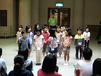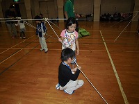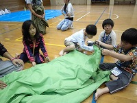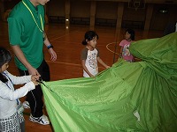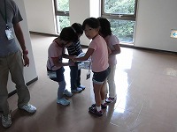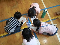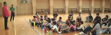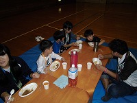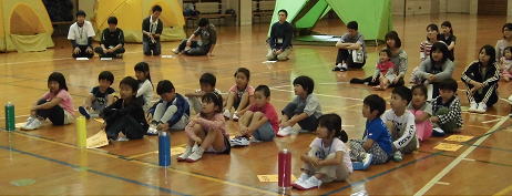| 2日目は、朝のつどいから始まりました。同じ日に宿泊していた、高校生のお兄さん、お姉さんたちに、『にこにこキッズ!体験塾』の紹介をして、ラジオ体操をしました。朝のつどいでも、おはなしを静かに聞くことができましたね。そして、大きなあいさつができたので、お兄さんお姉さんたちもびっくりしていましたよ! |