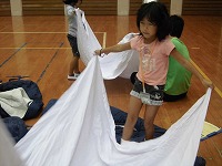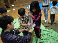 | 今夜はテントで寝ます。そのテントもみんなで協力して、張りました。テントの中では寝袋を使って寝ます!テントを張って、マットを敷いて、寝袋を準備して・・・みんなで力を合わせて準備をしました。翌朝の片付けももちろん、自分のことは全部自分でしました。テントでの寝心地はどうでしたか? |