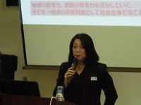 | 高校の中に子育てサロンを開設し、高校生と子育て中の親やその子どもとの交流を通して、現在の親への子育て支援と高校生という将来の親への子育て支援、家族の思いや親子の絆を再認識する家庭教育支援へとつながっている事例の発表がありました。 |