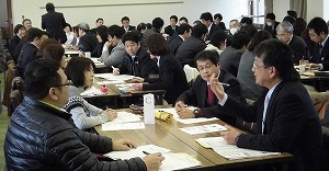 | インタビュー・ダイアローグを受け、「なぜ、連携が進まないのか?」「連携を進めていく上で必要なことは?」といったテーマでグループ協議をしました。県や市町村教育委員会、公民館、教育事務所、施設、保育所、小学校、中学校、特別支援学校と様々な立場の方々で小グループをつくり、短い時間でしたが、熱い意見交流となりました。 |