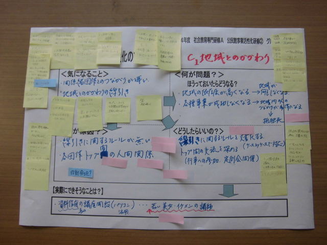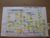 | 話し合いたいテーマの希望や役職ごとに分かれて、4〜5人のグループで熟議を行いました。テーマについて気になっていることを出し合い、そのことの何が問題で、何が原因なのか、じっくり熟議を行いました。グループ熟議の後は、各自で模造紙を見て回り、「なるほど!」と思ったところには、ピンクのふせん紙を貼りながら、全体交流を行いました。他市町村との交流はもちろんのこと、同じテーマでも、問題点や原因の分析の視点が、役職によって違うことなども交流することができました。最後は、それぞれが自分の役割の中で、何をしていくのか、各自で振り返りを行い、吉田先生より、まとめをしていただきました。 |