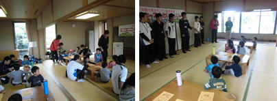 | 約1か月ぶりの再会です。今回も1泊2日ですが、前回の宿泊体験が自信となったのでしょうか、にこにこ笑顔で第3回目がスタートです。特に今回は、ボランティアの大学生がたくさん参加してくれているので、『はじまりの会』が始まる前からみんな元気いっぱい仲良く遊んでいます。今回も、『にこにこキッズ!体験塾のおやくそく』を守って、みんなで最後までがんばりましょう!! |