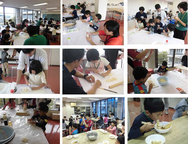 | 今日の夕食はうどんです。しかも自分たちで麺作りからします。粉がだんだんまとまっていき、麺棒でうすく伸ばしたら、細く切ります。すると、ちゃんと麺になっていました!自分たちで作ったうどんは最高においしかったですね♪ |