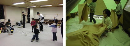 | 今回も、前回同様みんなでテントを張りました。 2回目ともなると手際よく、力を合わせてテントをたてることができました。翌朝の片付けももちろん、自分のことは自分でしました。 |